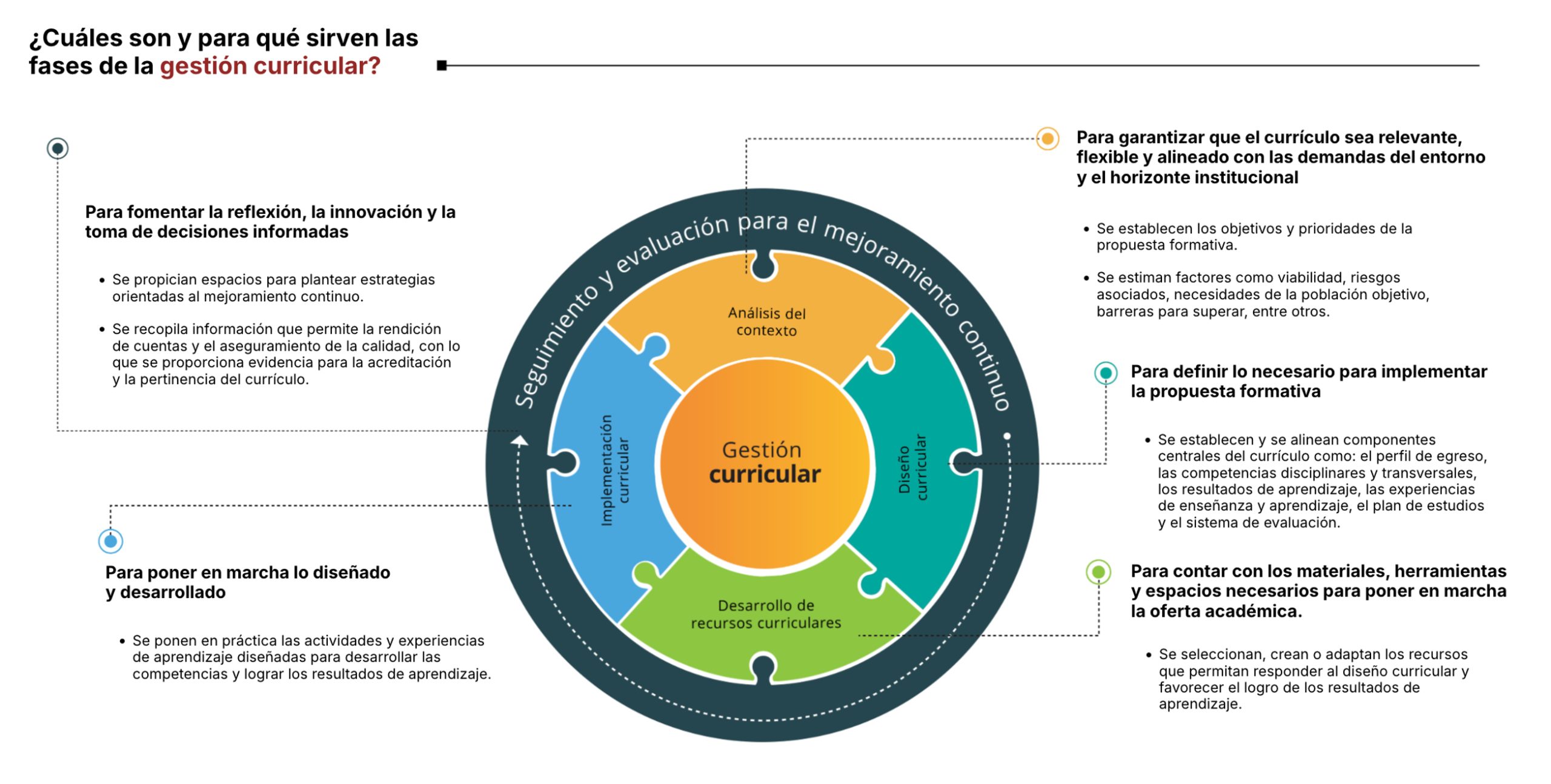 La gestión curricular está integrada por dos componentes interrelacionados que funcionan de manera concurrente: uno académico y uno organizacional. Estos componentes son transversales a toda la oferta académica, independientemente de la modalidad (presencial, virtual, híbrida o dual) para un programa académico formal completo, para un programa de educación ejecutiva o continua, un curso, una micro o macro credencial.